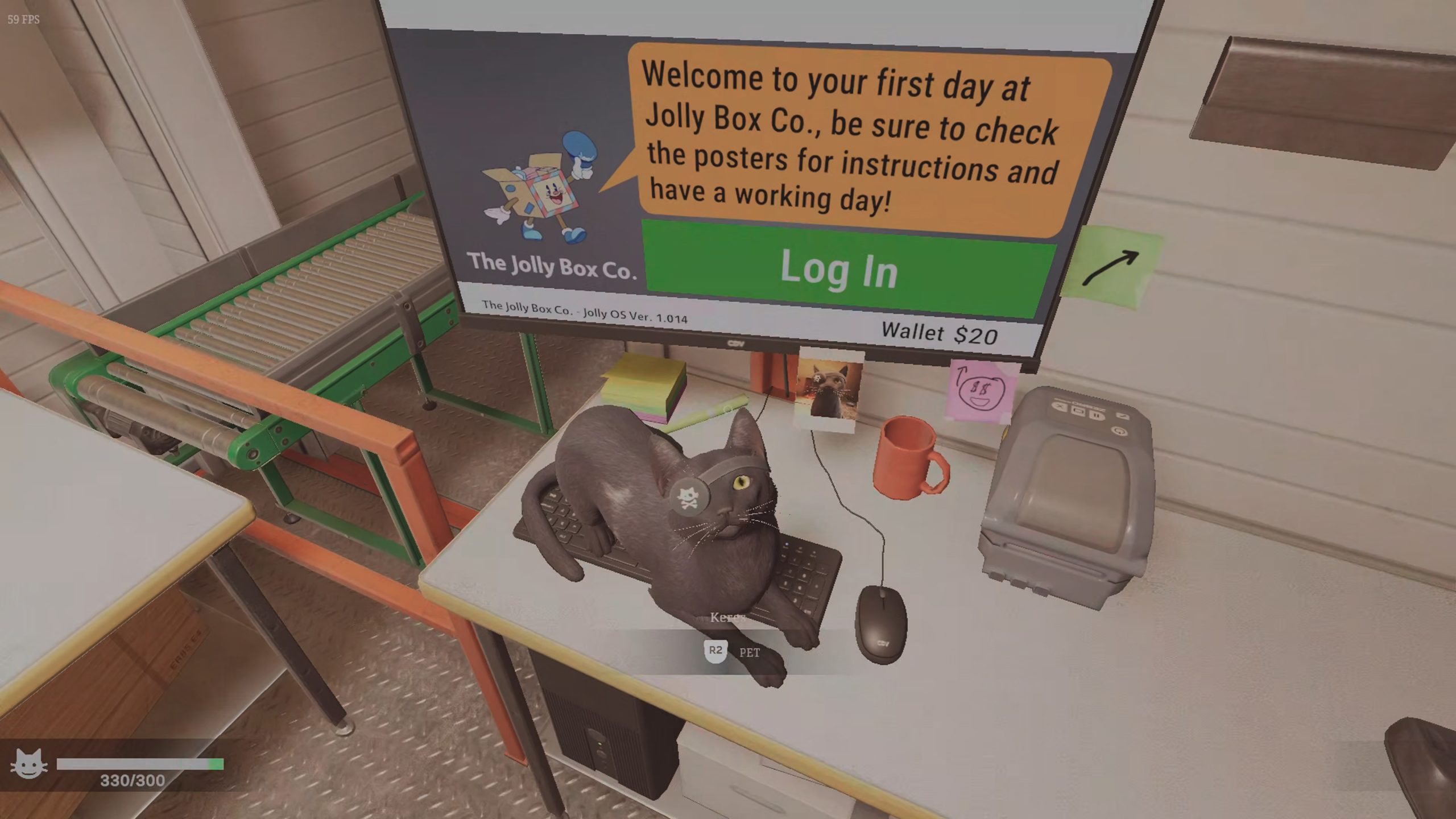 It is time to start our shift in the facility we find ourselves at Jolly Box Co. It is where our job is, and we also kind of sleep on site. Well, more than we have so many orders to get out, and we need a safe place to sleep and take care of our cat in the world. Maybe, so we can save up enough money to buy our way out of the “company store” situation that we find ourselves in. Not to mention, keep our anxious cat sated, as whatever supernatural thing that is going on in the building is scaring the poor little kitty too much. It is time to punch in on the clock and take a run through the warehouse to earn that scratch now, and maybe earn the Employee of the Year title by the end of it. As long as we are still alive, I guess.